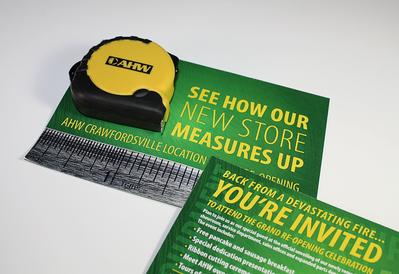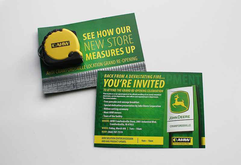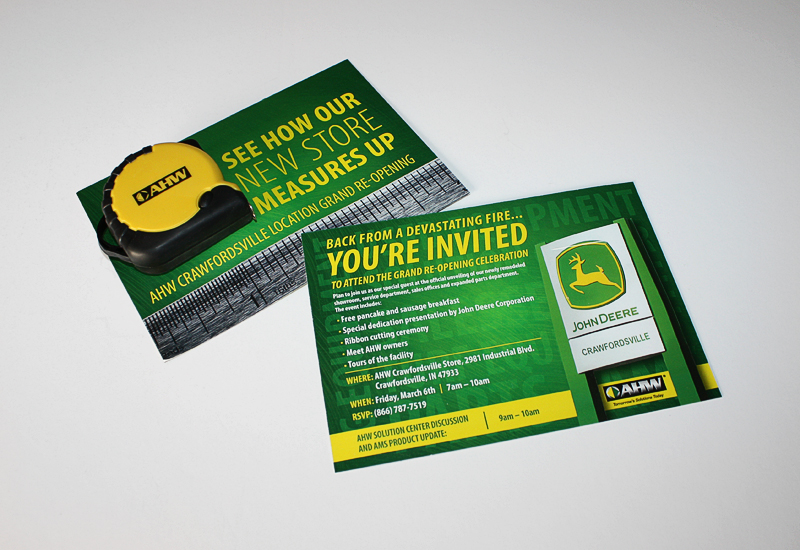AHW, a John Deere dealership with locations across Illinois and Indiana, needed a invite to advertise an open house for their recently renovated showroom in Crawfordsville, Indiana. The invite, mailed out to a select amount of premium costumers, included a branded measuring tape giveaway.